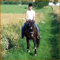 | Sabaa, ein wunderschöner Rappe, 4-jähriger Araberwallach, bekamen wir Anfang 2004 zur Vermittlung. Die bisherigen Besitzer mussten sich aus familiären Gründen von ihm trennen. Sabaa hatte noch keinerlei Ausbildung. Er kannte bis dahin nur den Auslauf auf einer Wiese im Ruhrgebiet zusammen mit seinen Gefährten. Nicole, eine junge Reiterin aus Frankfurt verliebte sich sofort in ihn und holte ihn im Frühjahr 2004 zu sich. Nach viel Bodenarbeit zwecks Vertrauensaufbau sollte Sabaa dann an Sattel und Reiter gewöhnt werden... Dabei traten erhebliche Probleme auf. Den Sattel akzep-tierte Sabaa, jedoch geriet er in absolute Panik, sobald sein Rücken mit Gewicht belastet werden sollte. Nicole unternahm alles menschenmögliche, um die Ursache dafür zu ergründen. Sabaa kam in eine Klinik und wurde geröntgt - ohne Ergebnis. Sie fuhr mit ihm nach München zu einem sehr bekannten sanften Bereiter, sie konsultierte Pferdeflüsterer, all dies kostete viel Geld, das nicht eingeplant war. Wir standen in engem Kontakt, aber so verzweifelt Nicole auch manchmal war, eines war klar: Sabaa und sie gehörten zusammen und selbst wenn er niemals reitbar gewesen wäre, wäre er das einzige Pferd geblieben, das sie wollte. Ich hoffe, ich konnte ihr aus der Ferne beistehen,habe ihr immer wieder Mut zuge-sprochen und ihr gesagt, dass ich froh bin, dass Sabaa zu ihr gekommen ist, wohl kaum jemand hätte diese lange und kostenintensive Odyssee in Kauf genommen, wo das negative Ergebnis schon festzustehen schien. Sie holte ihn wieder Heim nach Frankfurt und setzte die Bodenarbeit mit ihm fort, Belastung des Rückens war erst einmal kein Thema mehr. Sie sagte mir, dass er den Sommer 2005 erst einmal weiterhin frei auf der Koppel genießen sollte, dann würde sie weitersehen. Anfang August 2005 bekam ich ein E-Mail von ihr mit dem Titel : "Die schönsten Beweisfotos des Jahres..." und im Anhang fand ich 3 Fotos von Sabaa mit Nicole auf ihrem Rücken, nicht in der Reithalle oder in der Bahn - es zeigte einen ent-spannten Sabaa mit einer überglück-lichen Reiterin im Gelände... Gänsehaut pur - ich habe mich maßlos gefreut für die beiden! Später sagte sie mir, dass sie irgendwann das Gefühl hatte, jetzt sei der richtige Zeitpunkt und plötzlich hatte Sabaa kein Problem mehr... Für uns eines der be-wegendsten Erlebnisse aus unseren Vermittlungen. Pferde in Not sind oft so genannte "Katzen im Sack", wir wissen oft nicht genau, was sie erlebt haben und woher ihre Phobien stammen. Umso mehr sind wir auf echte Pferdefreunde angewiesen, die bereit sind, mit ihren Pferden auch einen steinigen Weg zu beschreiten. Ist der Punkt dann einmal überwunden, hat man einen Freund fürs Leben, Nicole und Sabaa, ohne einander nicht mehr vorstellbar. Das Foto der beiden spricht seine eigene Sprache... ! Conny von Zur Mühlen, KoMeT e.V. August 200 |
